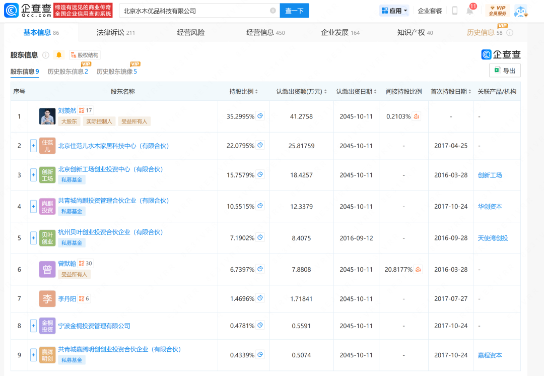 目前,劉羨然是住範兒第一大股東。據企查查,劉羨然持股比例約為35.30%。此外,住範兒第二大股東是北京住範兒水木家居科技中心(有限合夥),持股比例約為22.08%。北京住範兒水木家居科技中心(有限合夥)股東分別為曾默翰、宋海、劉羨然,持股比例分別為94.29%、4.76%、0.95%。
