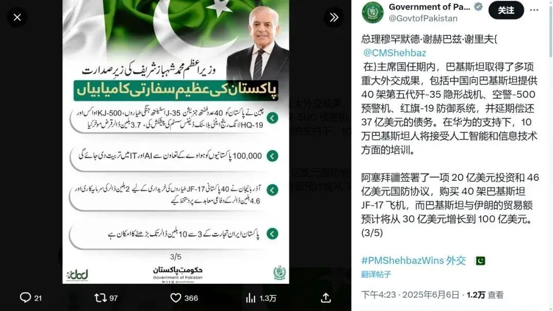 根據巴基斯坦政府官方賬號6月6日在社交媒體上公佈的信息,巴基斯坦總理謝里夫任內取得了多項重大外交成就,其中包括引進40架殲-35隱形戰鬥機,還有空警-500預警機和紅旗-19反導系統;同時還與阿塞拜疆簽署了40架JF-19“雷電”(即“梟龍”戰鬥機)戰鬥機的出口協議,並與伊朗的貿易額也從30億美元增加到100億美元。