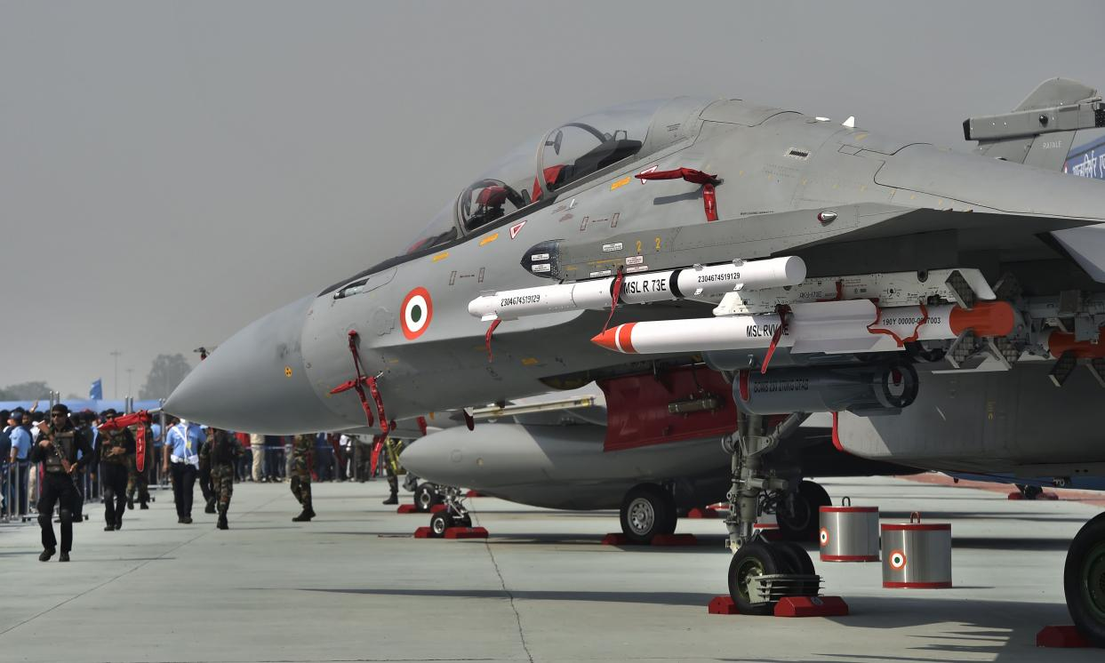 一架印度空軍蘇-30MKI戰鬥機在左翼下掛着無制導的R-73(外掛)和R-77導彈以及一枚自由落體炸彈。照片由Ajay Aggarwal/Hindustan Times通過Getty Images提供 印度斯坦時報