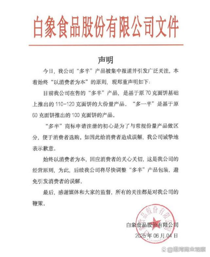 白象食品迅速也對此發表了聲明:目前公司在售的“多半”產品,是基於原70克麪餅基礎上推出的110~120克麪餅的大分量產品,“多一半”是基於原60克麪餅推出的100克麪餅的產品。