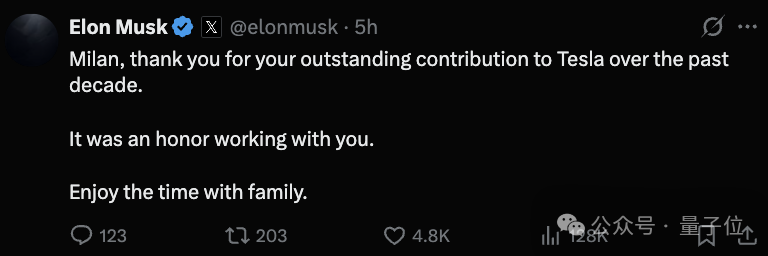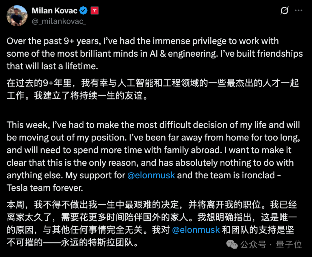 至於離職的原因,他明確表示這與特斯拉、馬斯克無關。之所以做出這一決定,只是因為自己想更多時間陪伴家人。