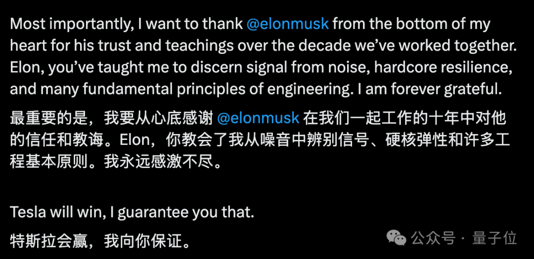同時他也感謝了特斯拉的同事們,尤其是馬斯克,盛讚他孜孜不倦的教誨,教會他從噪音中辨別信號、硬核彈性和許多工程基本原則。