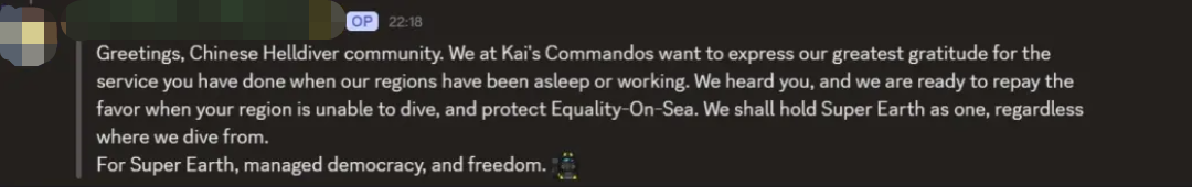 “各位中國潛兵朋友們,大家好!凱氏突擊隊(這個社區的名字)全體成員,謹對你們在我們地區在睡覺或工作時所做出的貢獻表示最誠摯的謝意。我們聽到了你們的心聲,並已準備好在你們地區晚上下線時報答你們的恩情,守護上海。無論我們來自哪裏,我們都將團結一致地守護超級地球。 為了超級地球,為了管理式民主,為了自由!”