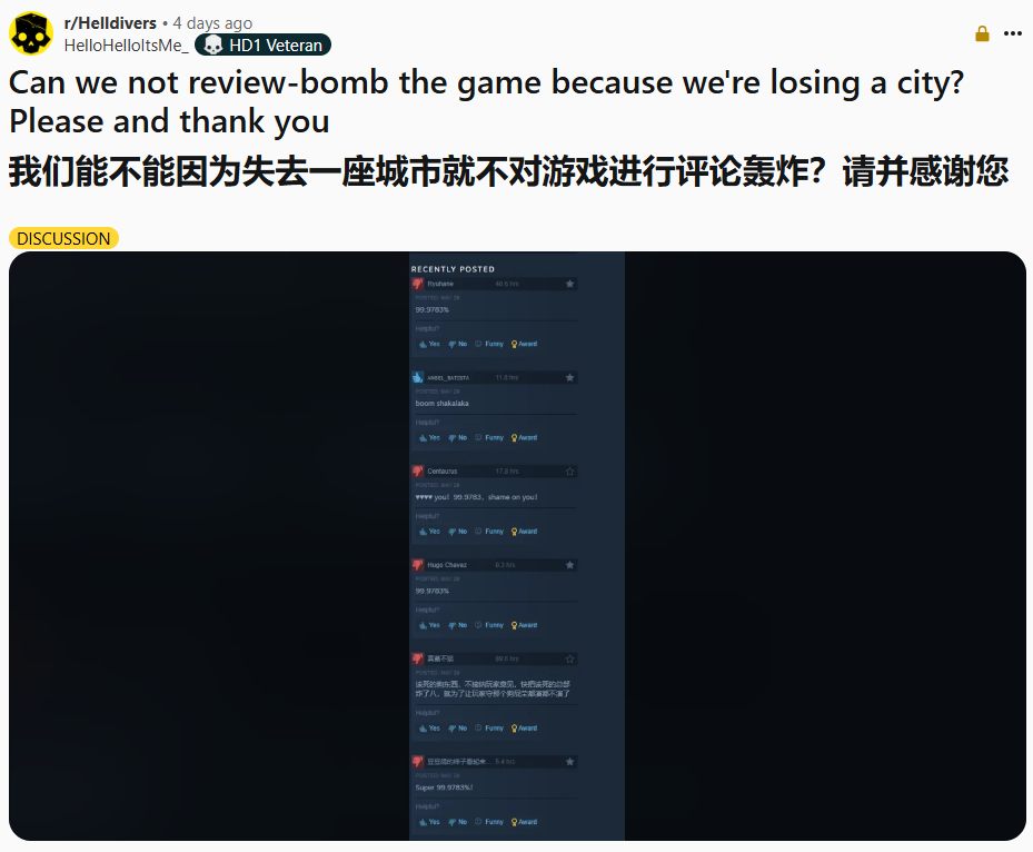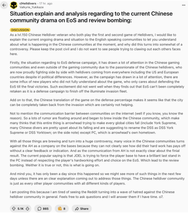 國外玩家也在Reddit發帖詳細闡述了新玩家的湧入和遊戲圖片翻譯錯誤導致一些中國玩家認為他們受到了遊戲開發商的不公平對待,最終誤會解除。