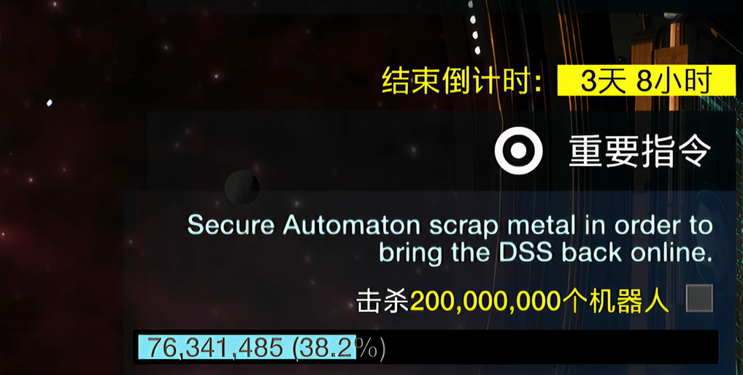 任務要求玩家去機器人星球擊殺2億個機器人以修復DSS。DSS全稱“民主空間站”,是人類的超級兵器,能為戰場提供戰略級火力,在光能族入侵地球之前就被打壞了。這個任務可以説是目前四線作戰中最難的一條線。