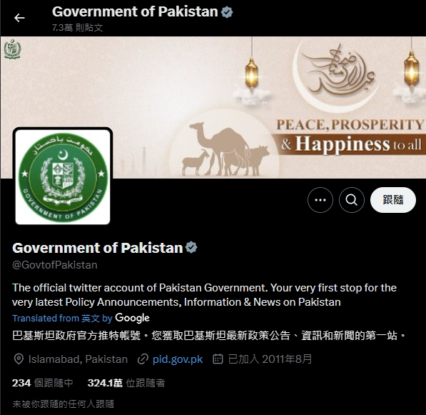 但是大伊萬去看了之後……發現……這還真的是巴基斯坦政府的官方賬號,賬號帶認證,而且介紹寫的一清二楚,這就是巴基斯坦政府的官方號。
