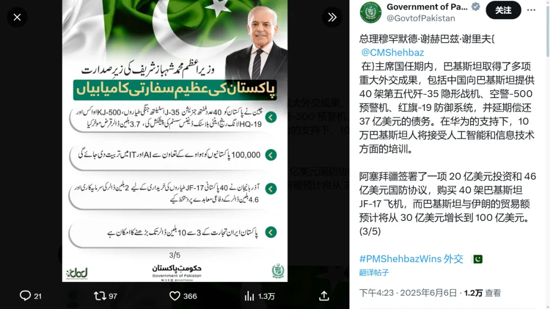 ID是“Government of Pakistan”的X賬號這幾天在整大活!昨天,該賬號接連發了好幾條巴基斯坦總理謝里夫上台之後達成的成就,其中包括對美,對華,對重要國際組織等等。當然最引人注目的,還是對華軍貿。