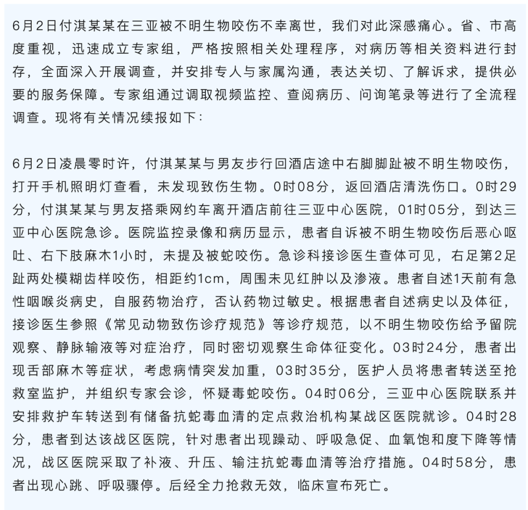 近日,一遊客在三亞被不明物咬傷身亡的事情引發廣泛關注。據三亞市衞健委6月5日發佈的最新通報顯示,死亡原因正在進一步查明。