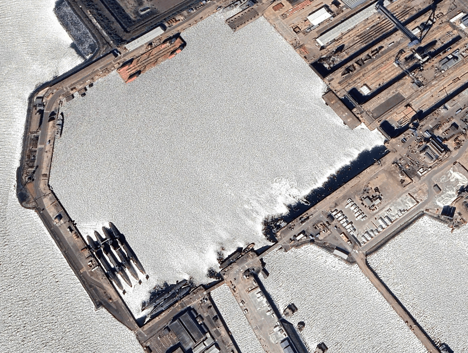 2025年5月的羅塞斯衞星視圖。六艘退役潛艇停泊在水面上,“迅捷號”潛艇可見於圖像右上角的幹船塢中。谷歌地球