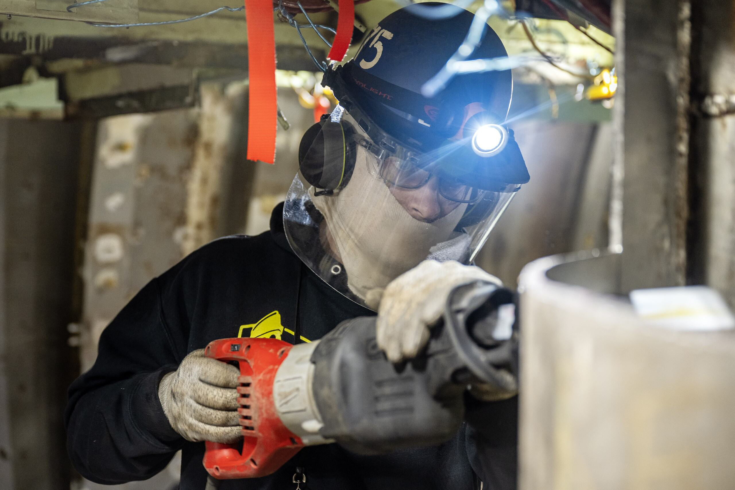 2024年9月23日,在華盛頓州布雷默頓的普吉特灣海軍船廠和中級維修設施,一名工業工人使用電鋸切割退役的“海曼·G·里科弗”號潛艇。美國空軍參謀軍士尤金·奧利弗(Eugene Oliver),國防部