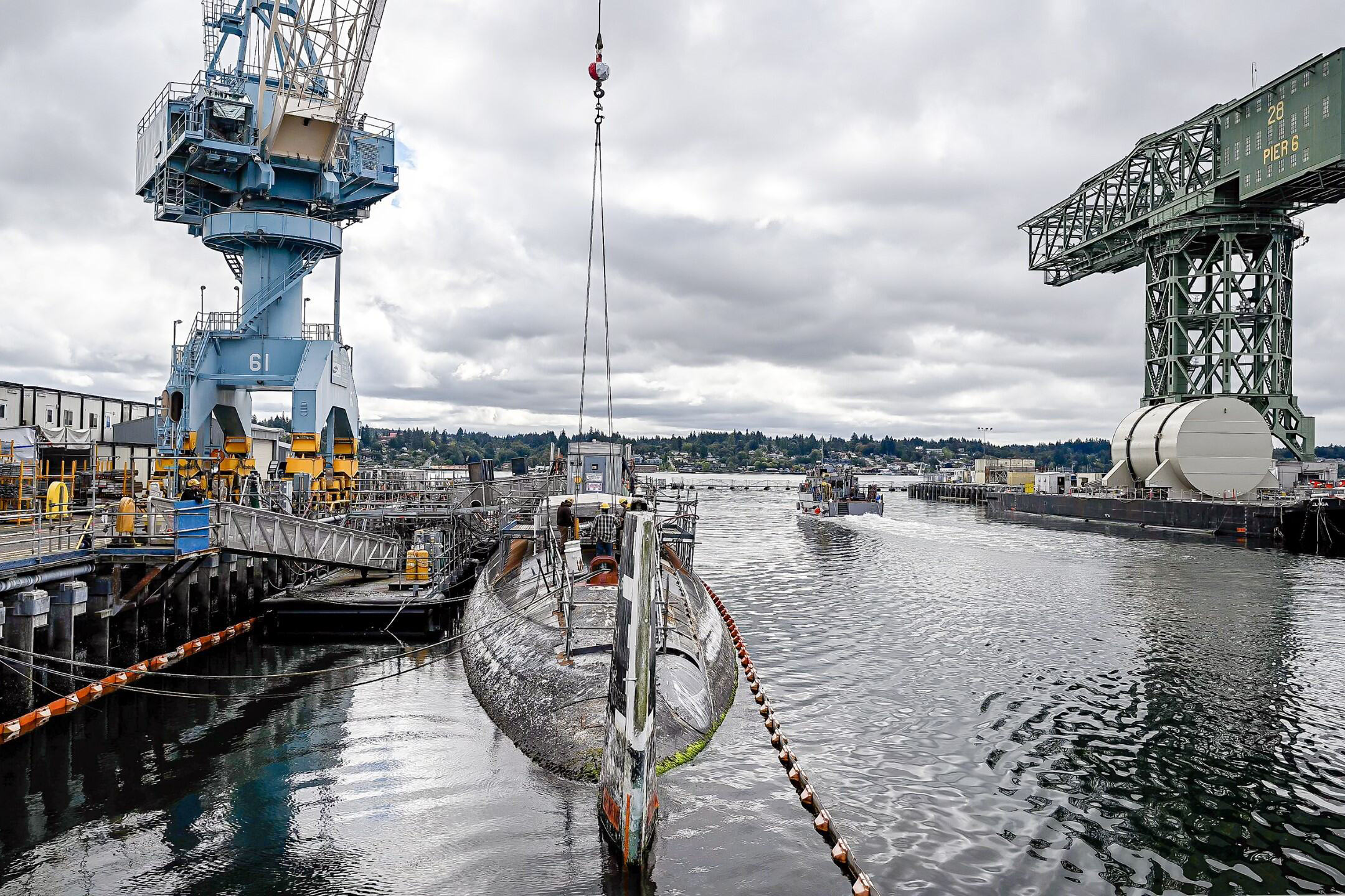 2024年9月23日,在華盛頓州布雷默頓的普吉特灣海軍船廠和中級維修設施碼頭,“海曼·G·里科弗”號(USS Hyman G. Rickover)潛艇漂浮在碼頭上,回收人員正在拆解這艘退役的核潛艇。美國空軍參謀軍士尤金·奧利弗(Eugene Oliver),國防部