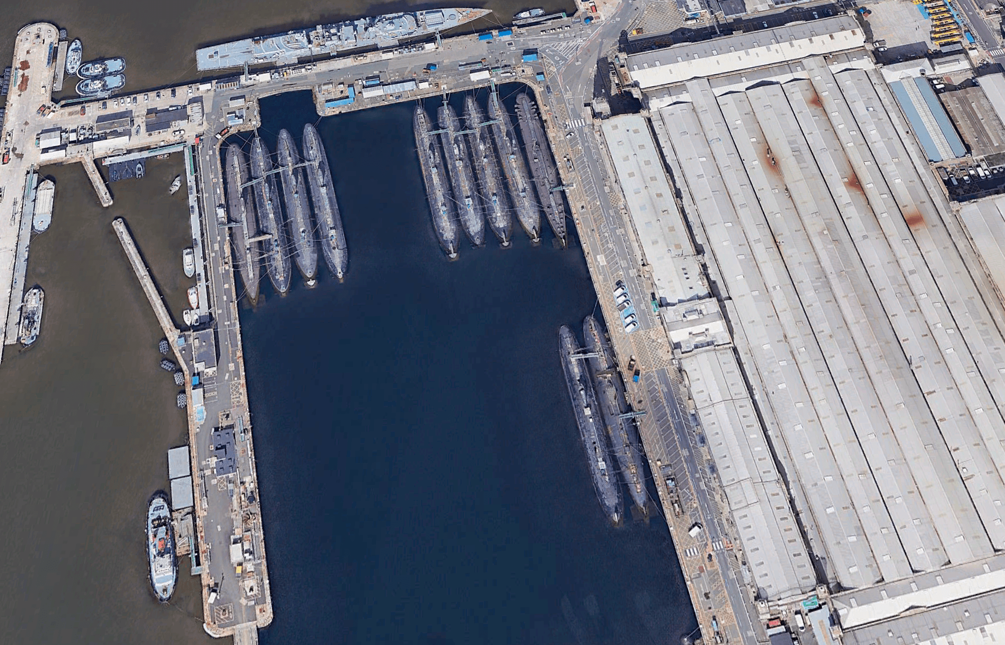 2020年5月,德文波特3號船塢中的11艘退役潛艇。如今,這裏又增加了5艘潛艇。谷歌地球