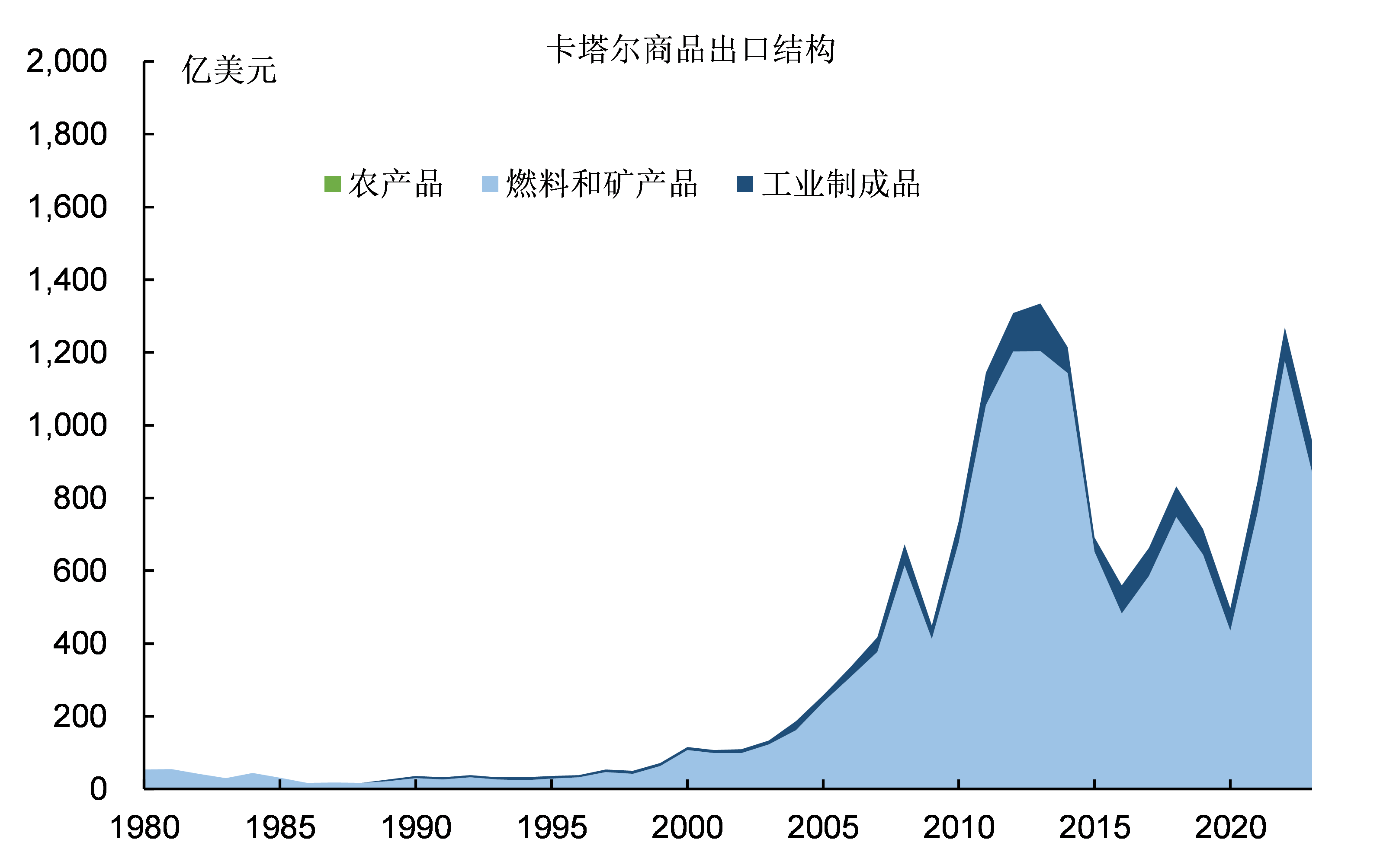 卡塔爾2023年的商品出口金額是978億美元,其中近九成(88.9%)的商品是資源產品,包括石油和天然氣。