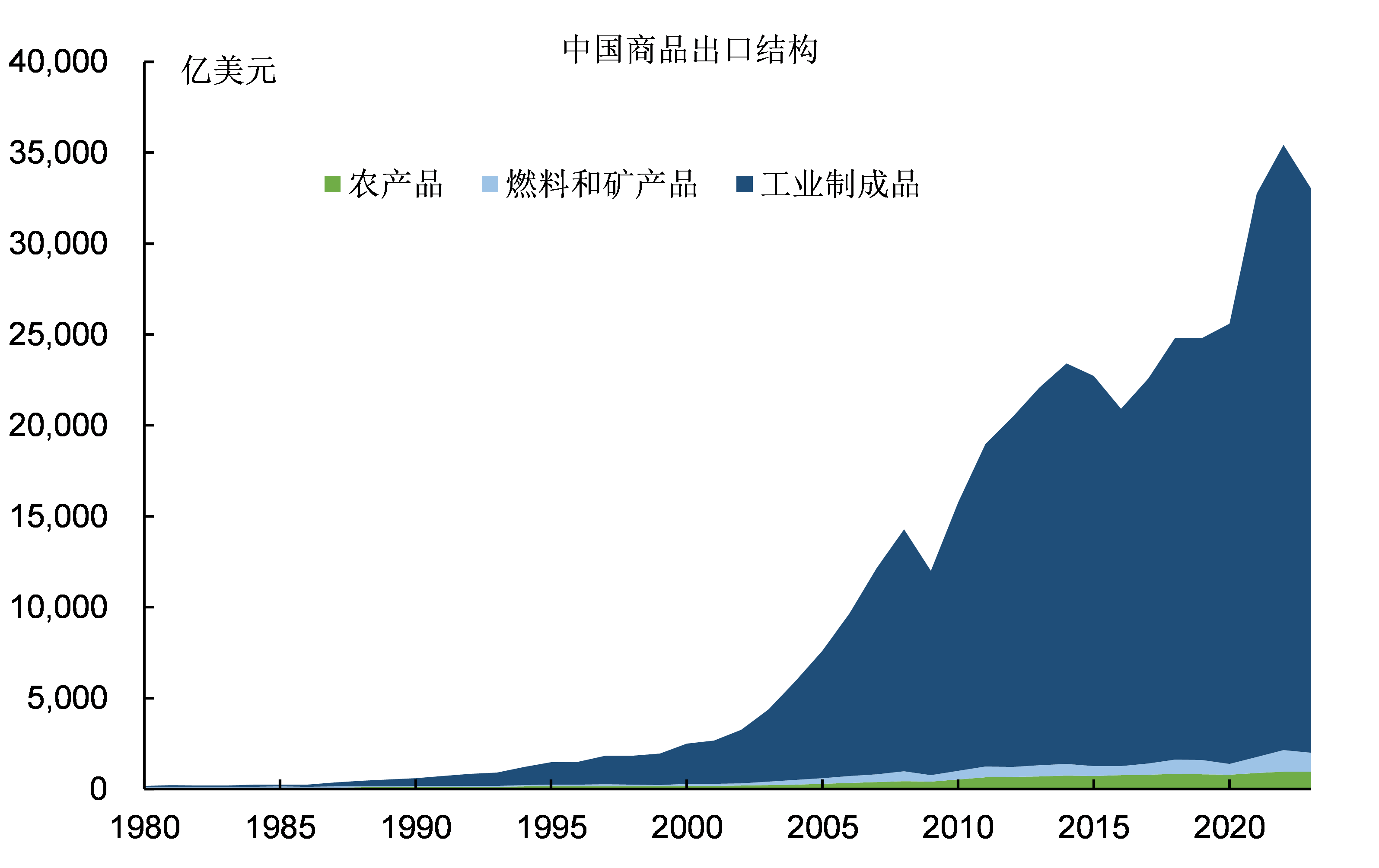 中國的商品出口規模能夠成為全球第一,主要靠的就是工業製成品。