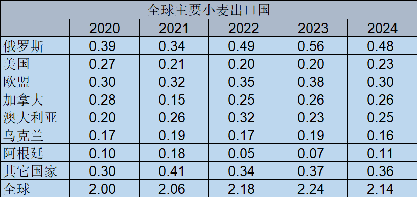 全球小麥的年出口量大概在2億噸左右,一噸小麥的價格在350美元/噸左右,全球小麥的年出口總額大概在700億美元。