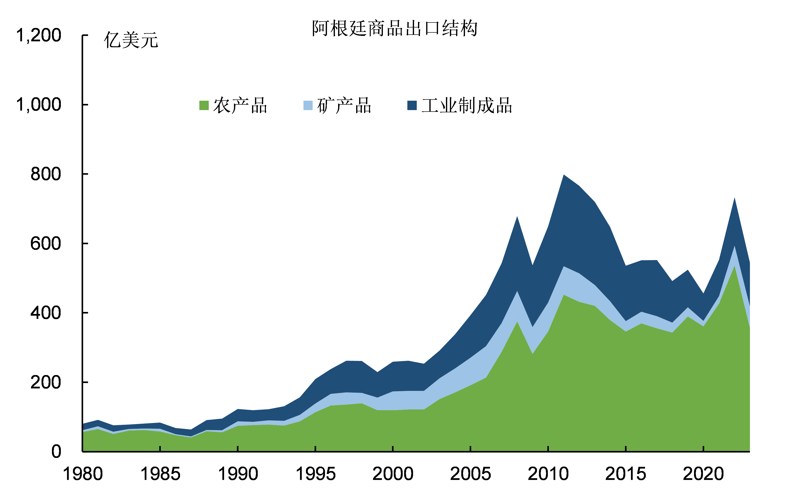 農產品是阿根廷最主要的出口產品,農產品出口金額佔阿根廷出口總額的比例長期保持在50%~60%,80年代時期甚至超過70%。