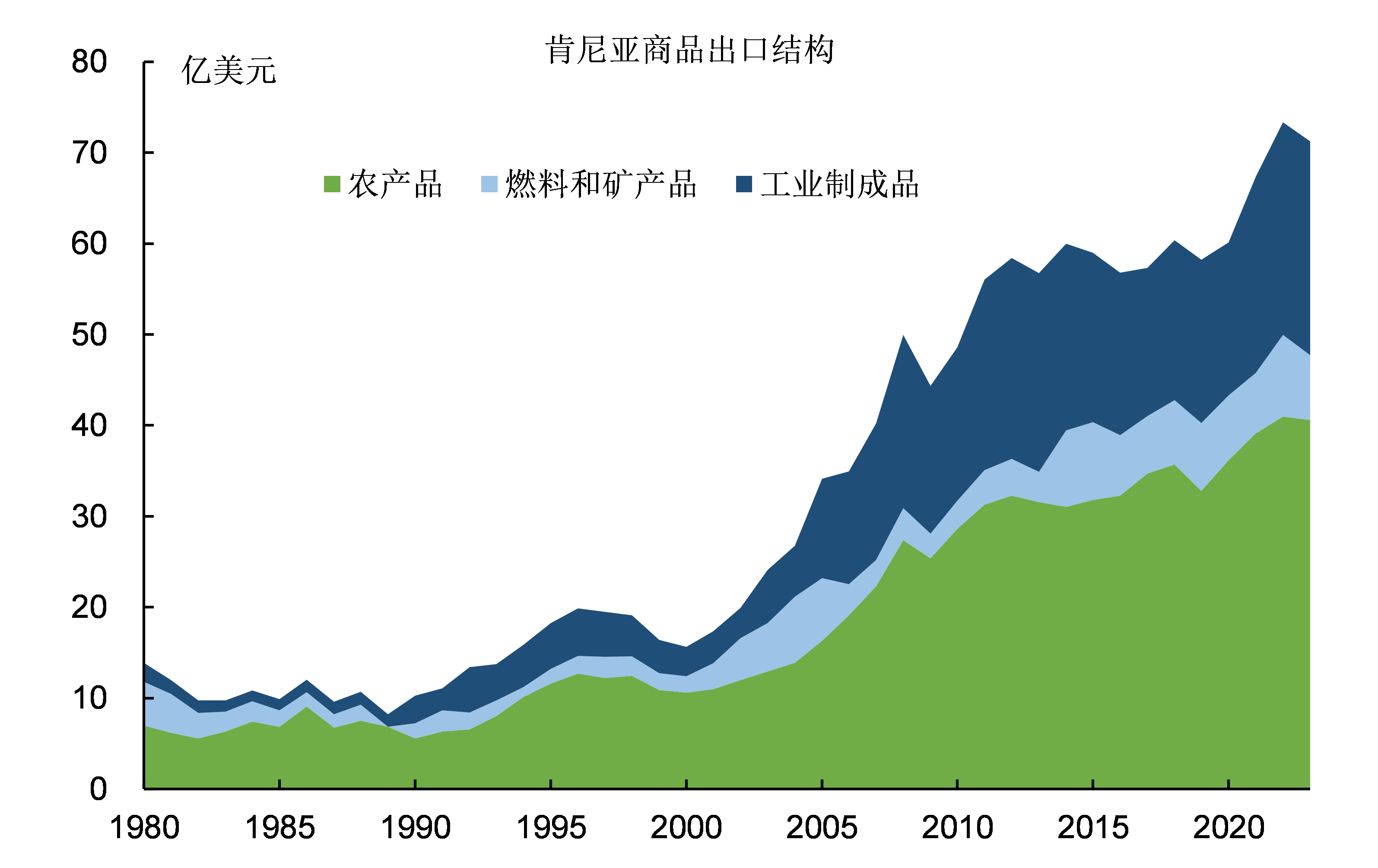 但是兩國出口規模的絕對值都很低:2024年埃塞俄比亞的商品出口金額只有45億美元,而肯尼亞只有82億美元。