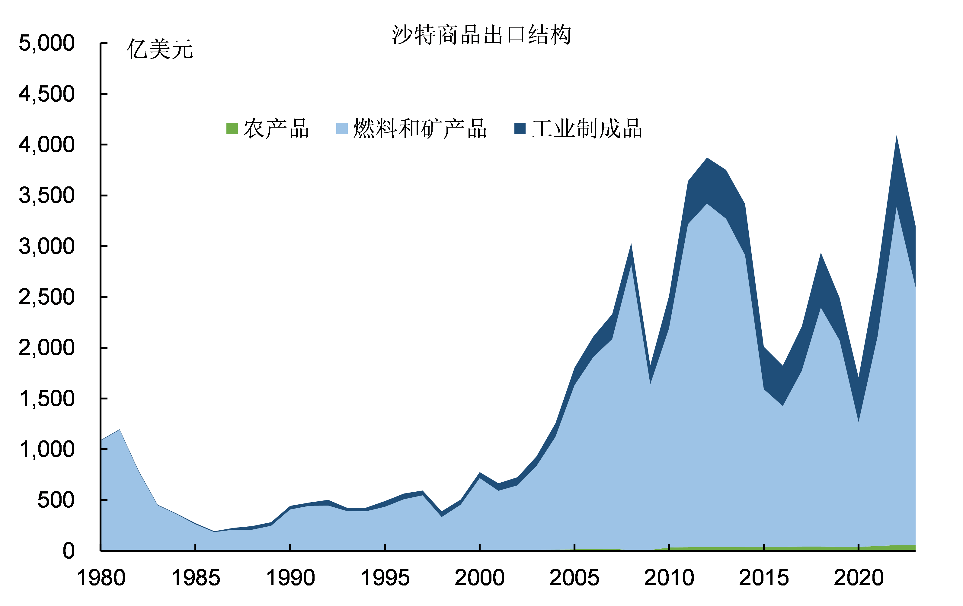 沙特2023年的商品出口金額是3200億美元,其中近八成(79.2%)的產品是資源產品,主要是石油。