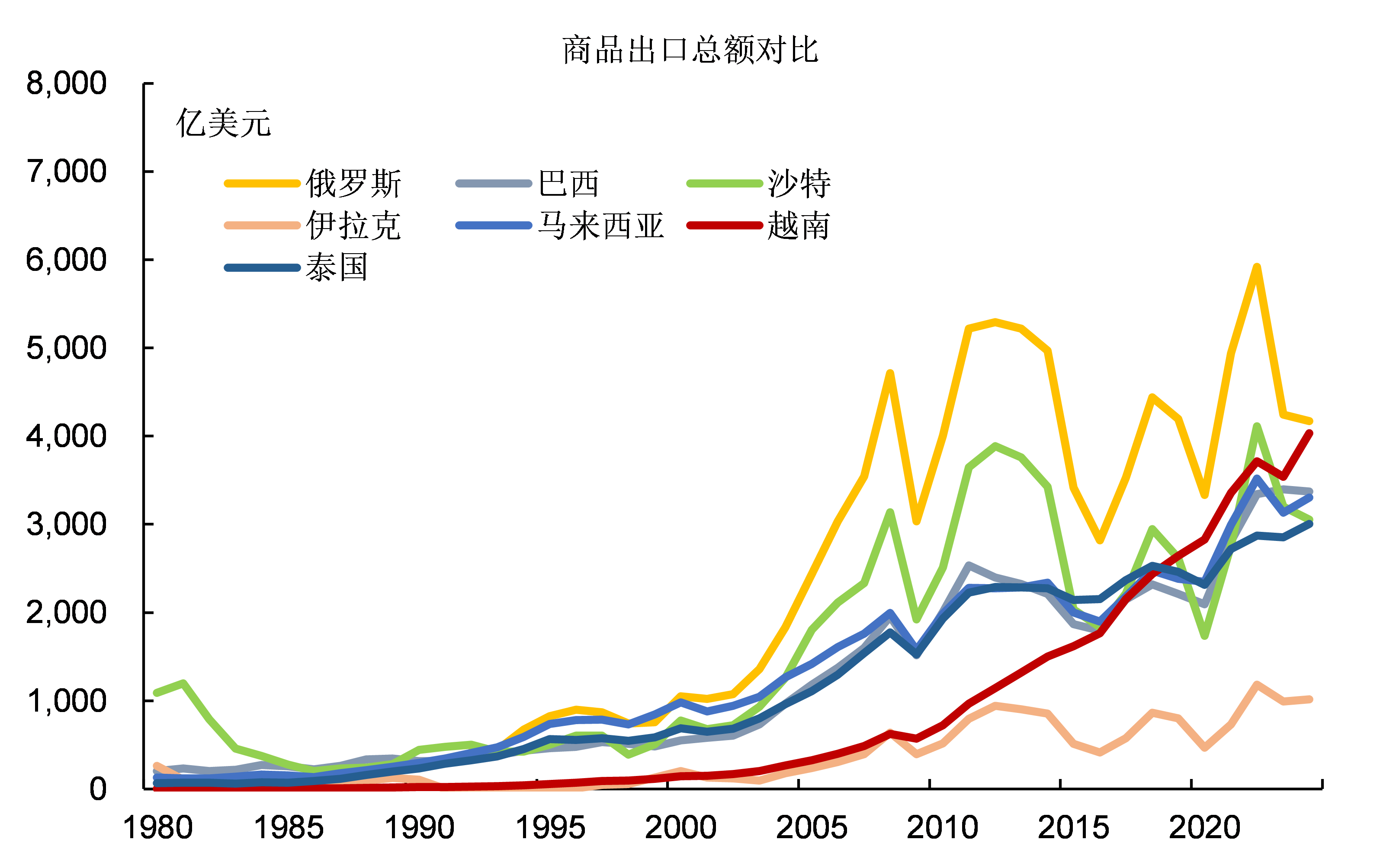 2024年越南的商品出口金額是4032億美元,與俄羅斯基本相當,超過巴西和沙特。