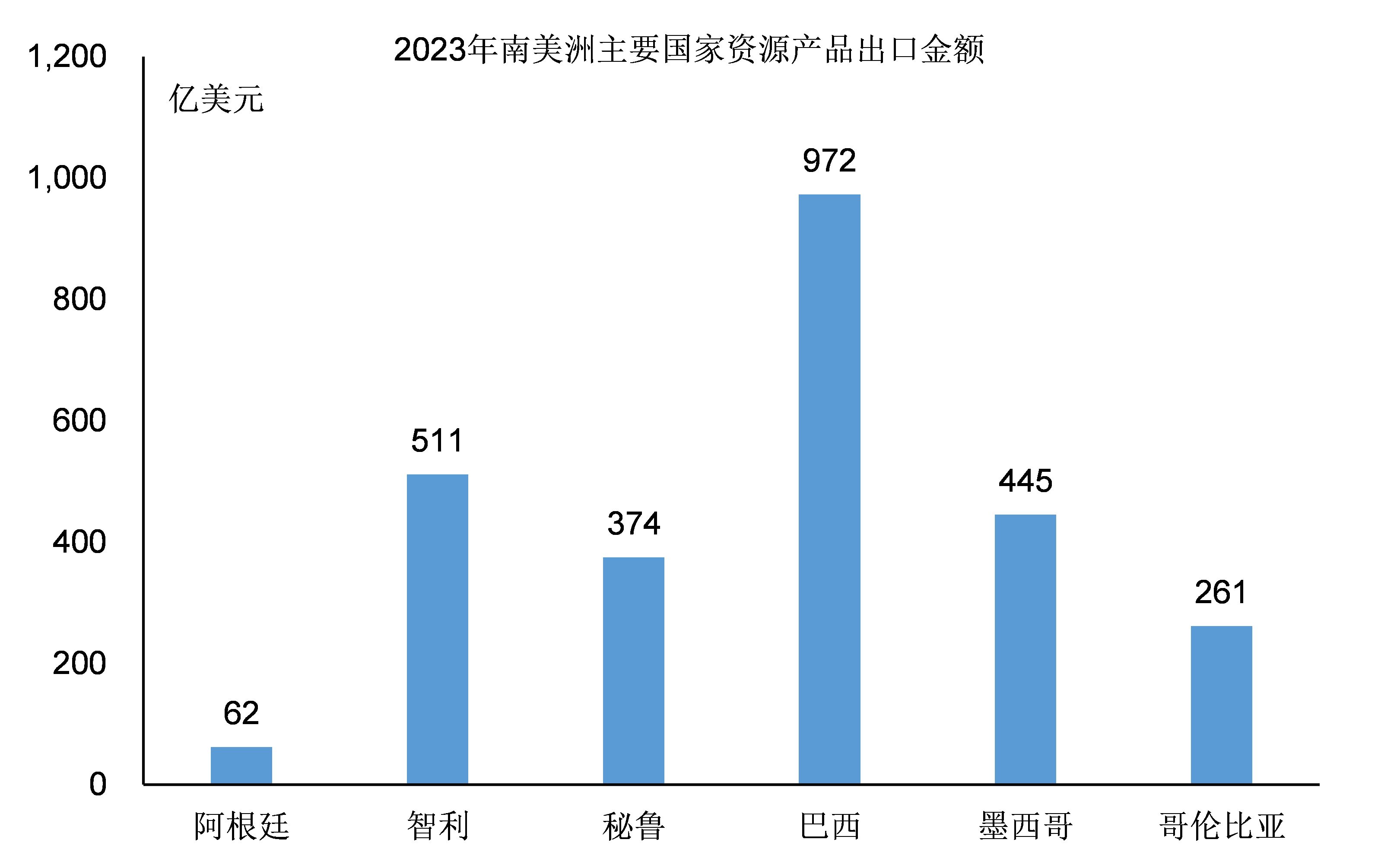 拉美資源產品出口規模最大的國家是巴西、智利和秘魯等國家,所有國家2023年資源產品出口的金額都沒有超過1000億美元。