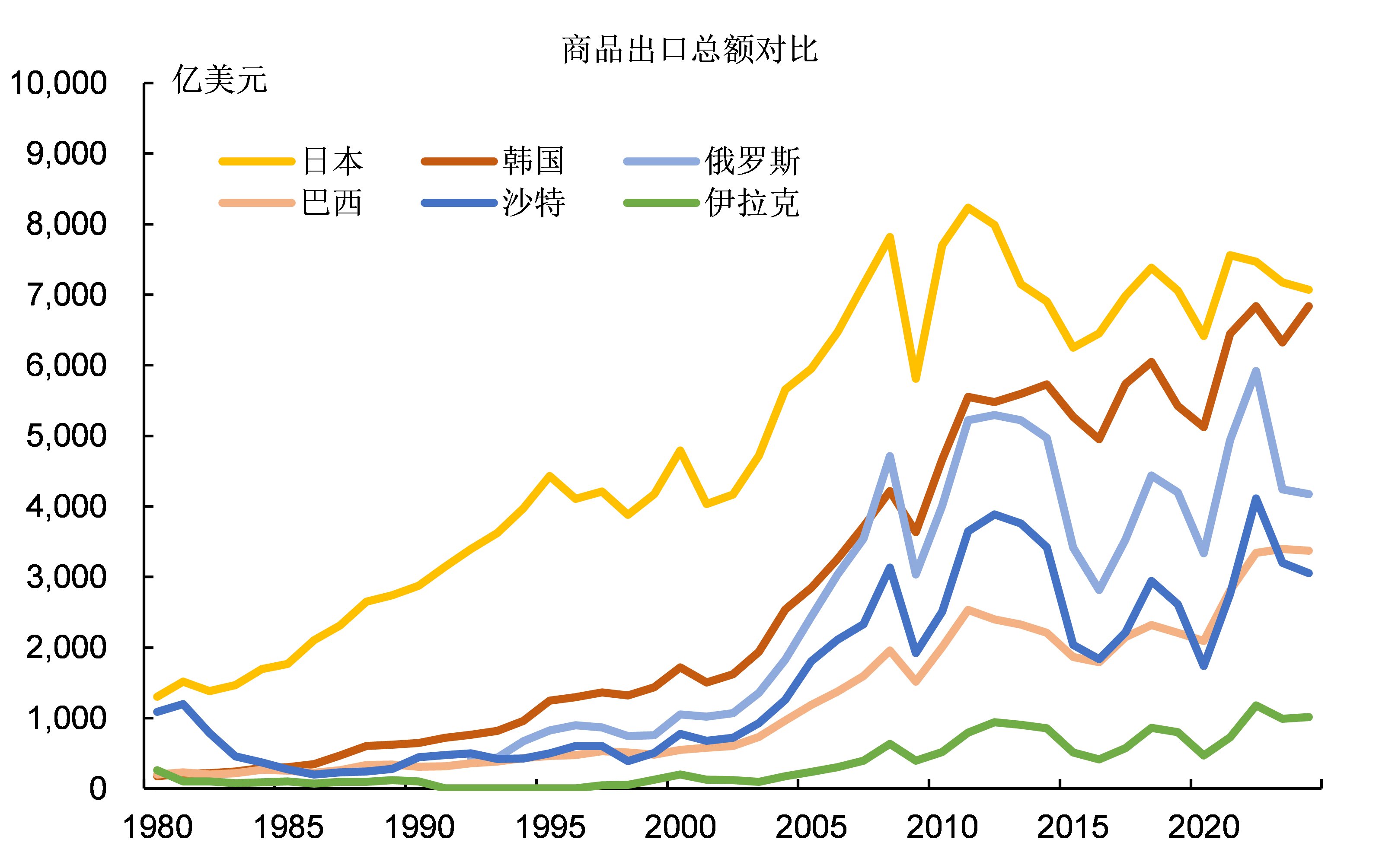 從1980年到2024年,日本的商品出口金額一直都超過俄羅斯、巴西和沙特等全球最大的資源產品出口國。