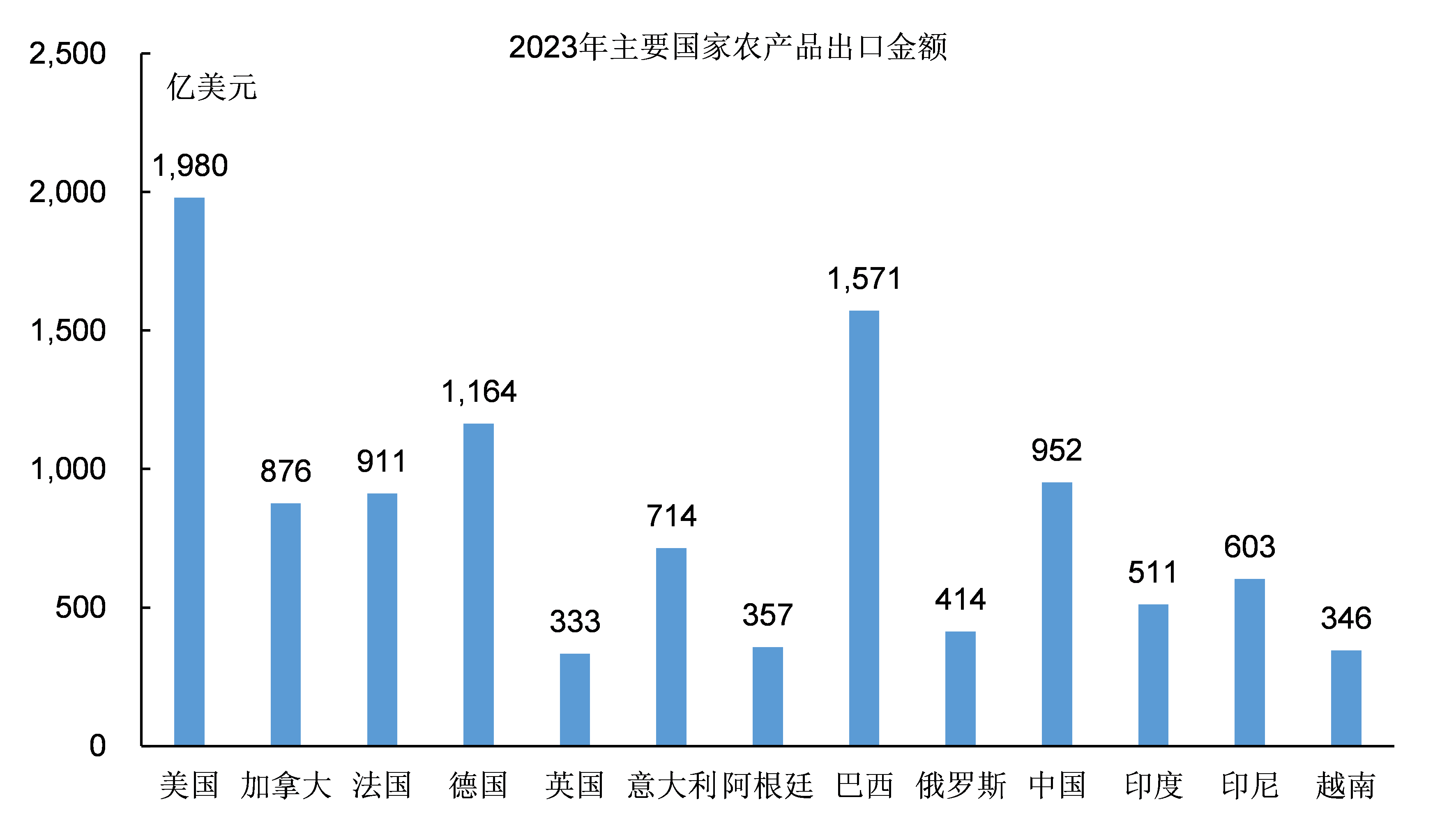 即使是全球農業條件最好的美國和巴西,2023年兩國農產品的出口金額也只有1980億美元和1571億美元。