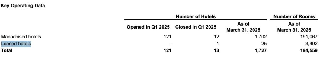 規模增長,隨之而來的是收入增長。2025年一季度,加盟管理酒店的收入同比增長23.5%至10.32億元,給集團貢獻超一半收入。相比之下,亞朵自營租賃酒店數量同比減少19.4%,從31家降至25家,收入也從1.68億元同比下降23.5%至1.29億元。