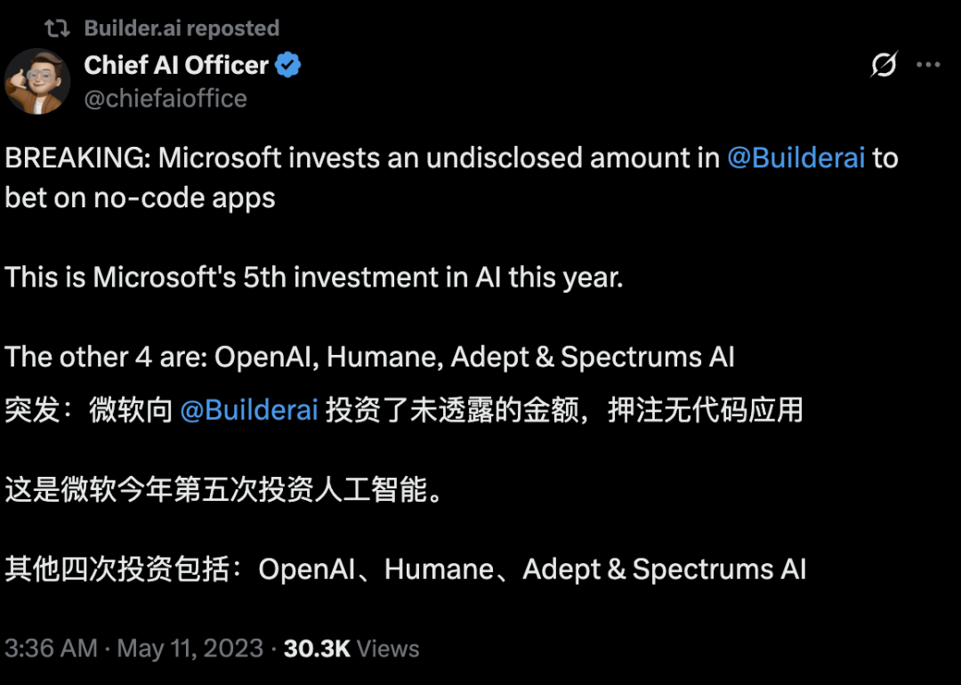 甚至把微軟都吸引過來,對其進行了戰略性投資,至於投進去多少,沒公開,但據 Builder.ai自己説是“數額巨大”。