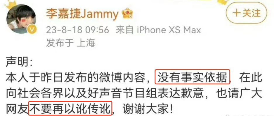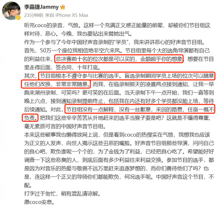 很快,聲稱是《中國好聲音》前學員李嘉捷發博聲援,曝光節目更多內幕。