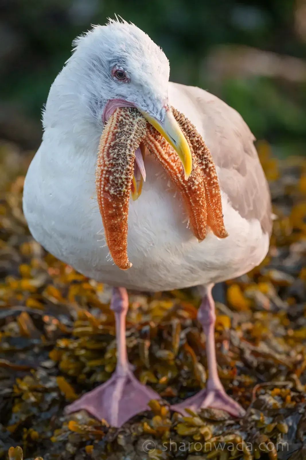 西北漁業科學中心的研究漁業生物學家湯姆·古德 (Tom Good)逐步解釋了海鷗吞食海星的過程。首先,海鷗不斷擠壓吃到嘴的海星,將其整個吞入口中。海星張開的腕就會被全部擠壓進海鷗嘴裏。