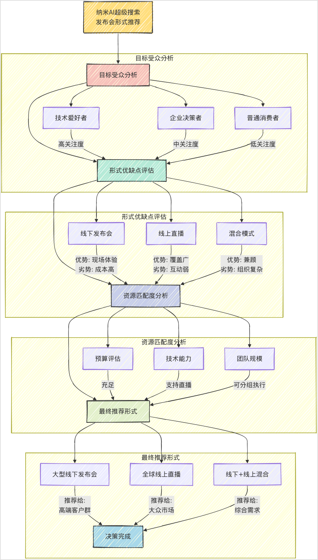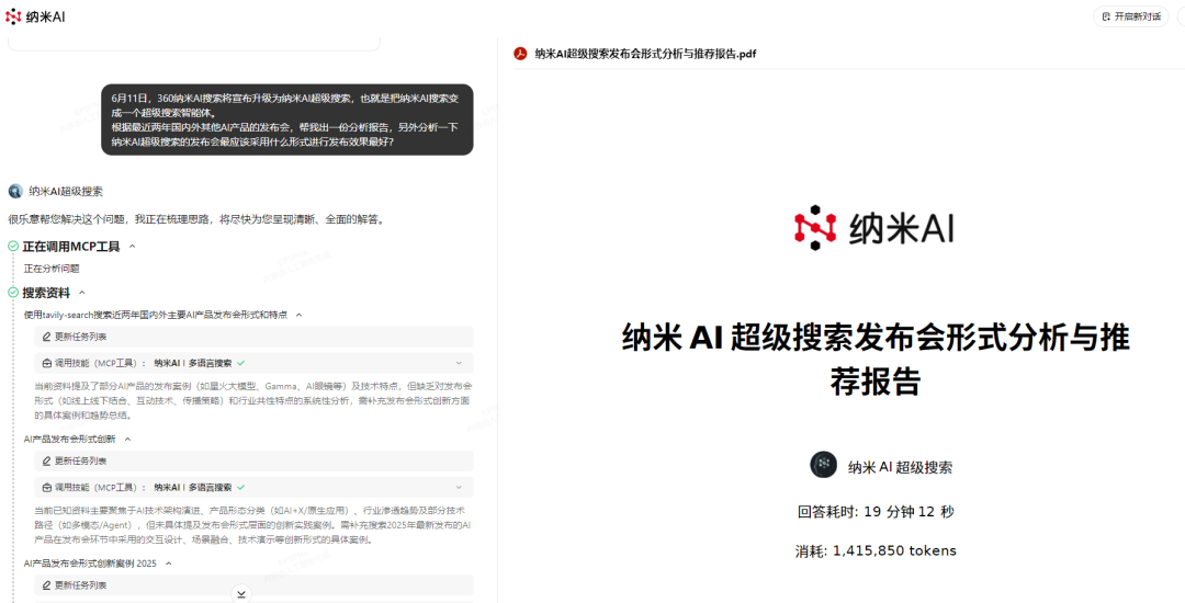 以發佈會事先準備環節中,分析納米AI發佈會將採用哪種形式發佈效果最好? AI藍媒匯將相關需求,發給納米AI超級搜索智能體後,後者會直接調用MCP工具,對用户需求進行詳細分析,並將任務主要拆解為三部分:搜索資料、生成數據圖表、撰寫研究報告。