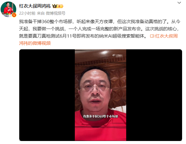 6月6日晚,周鴻禕突然發視頻説,他準備幹掉360整個市場部,並要挑戰“一個人完成一場新產品發佈會”的目標。