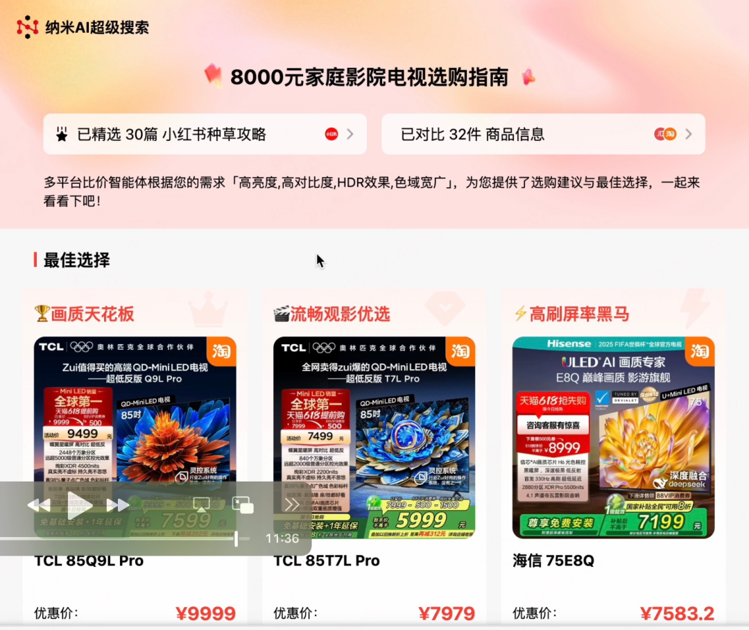 它甚至會自己打開商品詳情頁,打開裏面的評價區,光標甚至專門點擊了差評,把差評的點也圈選了出來。最終,納米AI超級搜索推薦了三款電視,並彈出提示語言,問要不要直接放到購物車中。