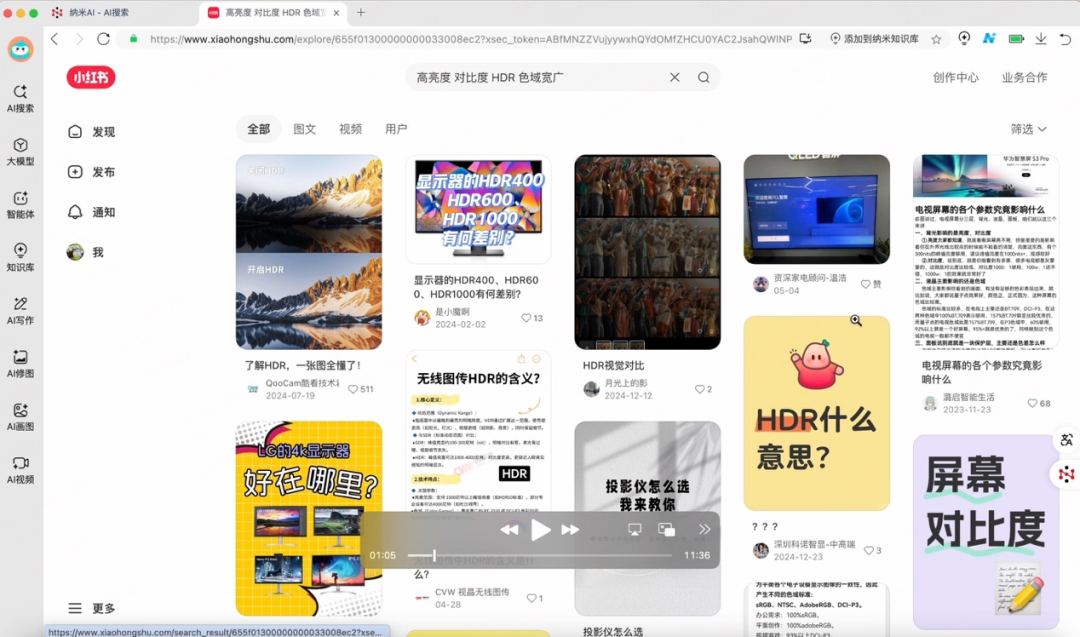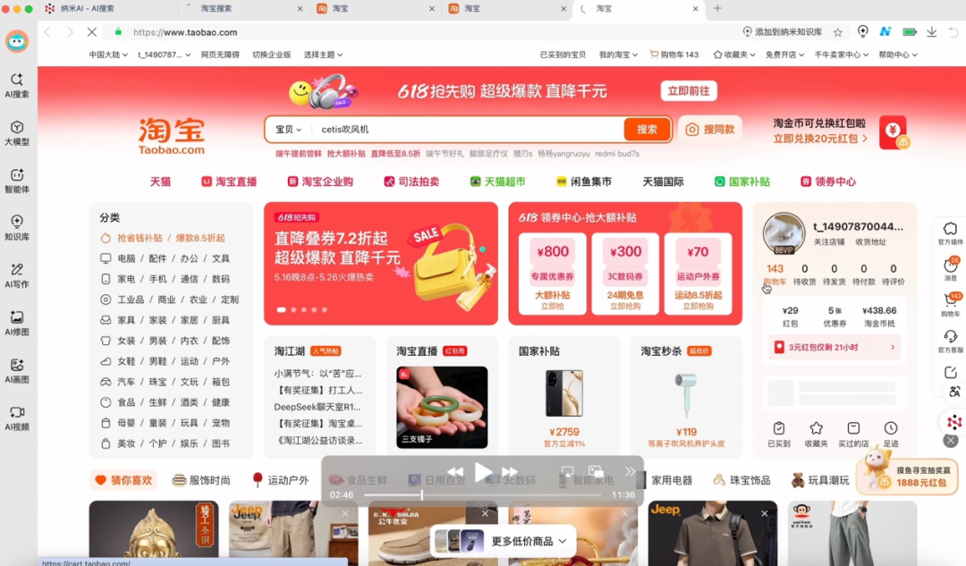 神奇的一幕出現了,在用户手指和鼠標都沒有做任何動作的情況下,納米AI超級搜索居然自己打開了小紅書,一篇篇的小紅書筆記開始在屏幕上切換,宛若虛空操作,再往後,它又打開了淘寶和京東的網頁。