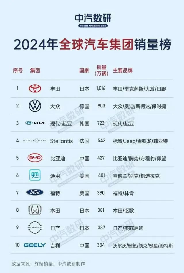 比亞迪和吉利躋身2024年全球汽車集團銷量榜前十