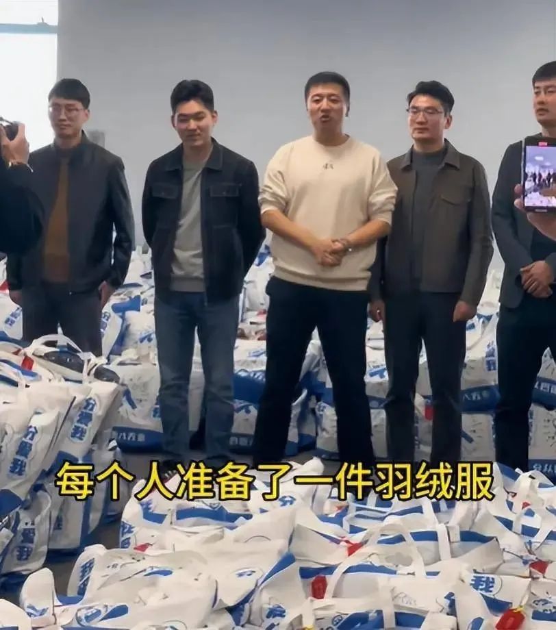 隨後,他又在員工的工資裏多打300塊錢,讓他們吃過年的第一頓豬肉,併為每位員工以及他們的家人,送上羽絨服。