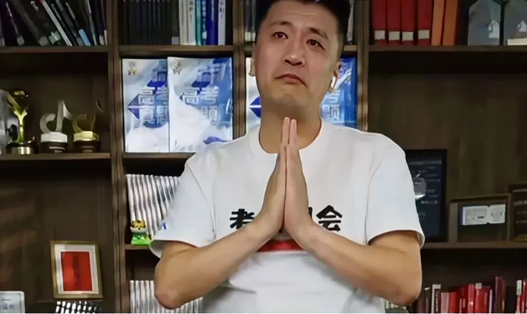 他眼含熱淚雙手合十,嘴角向下,向屏幕前的家長和考生深深鞠躬,説了兩遍自己真的已經盡力了。