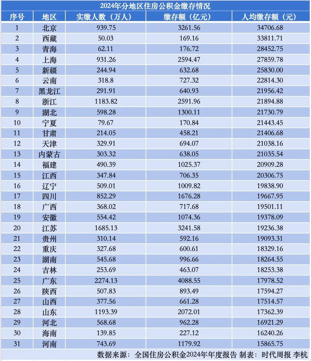 以此為參照,31個省份中共有14個超過了全國水平,其中北京居首,人均繳存額為34706.68元,西藏以33811.71元排名第二,青海憑藉28452.75元躋身前三。