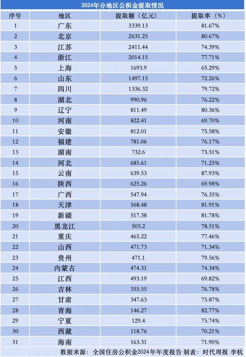 分地區來看,提取額最高的三個地區與繳存額排名一致,為廣東、北京和江蘇,分別為3339.13億元、2631.25億元和2411.44億元。
