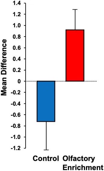 先前實驗發現,嗅覺刺激增厚了海馬體、內嗅皮層和內側顳葉等大腦結構,這些結構的厚度增加與嗅覺辨別能力和整體認知的改善有關。而內嗅皮層厚度的變化與高級認知能力中的執行功能的改善呈正相關。