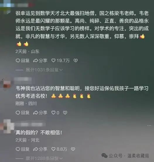 現實總是比故事更復雜。賬號停更,學校和家屬還在談。粉絲還在漲,評論還在刷。有人建議每週更一次,有人勸乾脆註銷算了。韋東奕沒有表態,家屬代為應對。外界還在爭論:應該讓專家走進短視頻,還是保護他們遠離流量?有人説他不食人間煙火,有人説他被推上了風口浪尖。