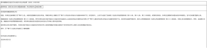 據杭州市住房公積金管理中心在今年4月21日發佈的《責令限期糾正違法行為決定書》(杭公積金責〔2025〕010273號、010278號)顯示,在該公司錄用職工竺某某等17人後,未按月足額繳存住房公積金,導致該單位少繳職工竺某某等17人的住房公積金合計金額共898977元,少繳職工唐明的住房公積金共計金額59291元等,經事先告知後,該公司在期限內未提出陳訴申辯意見,至今仍未履行整改義務,該中心責令限期糾正,否則將申請法院強制執行。