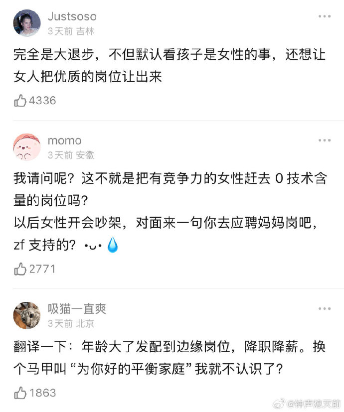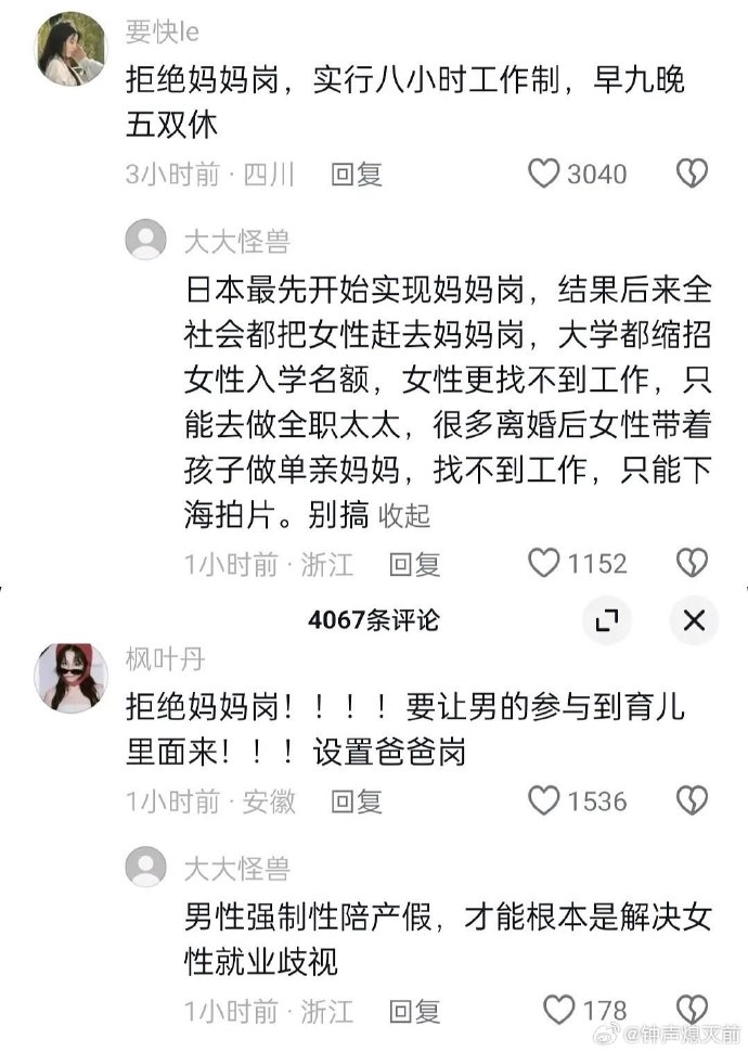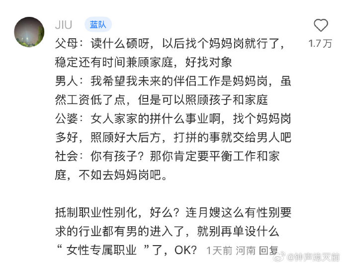 不過,針對“媽媽崗”網上也出現了一定爭議,有網友認為”媽媽崗“的出現,是默認育兒是女性自己的責任,這樣看似提供便利,實際上在職場上邊緣化了女性,剝奪了女性工作機會,降低了女性的職場競爭力。
