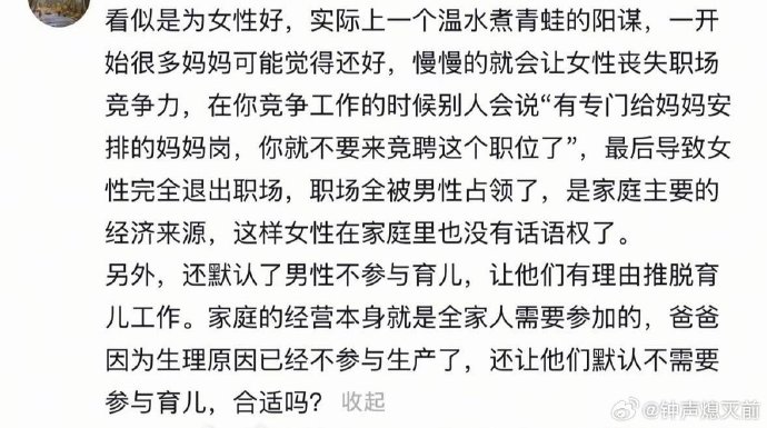 有人質疑“媽媽崗”是默認育兒是女性責任,這會降低女性職場競爭力,你怎麼看?_風聞