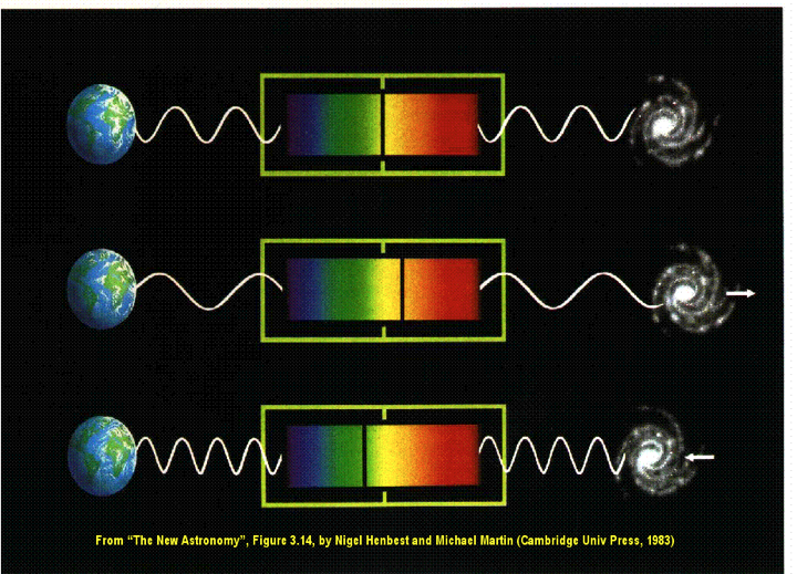 星系的紅移和藍移示意圖。當星系向觀測者運動,光譜會向藍端移動,反之則向紅端移動。光譜中間的黑線是一條吸收譜線,在靜止座標系裏譜線的位置完全由原子物理決定,它可以作為測量光譜移動的探針。