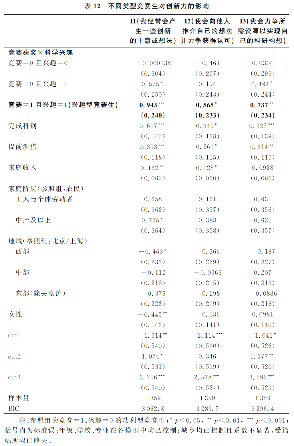 表12展示了興趣型與功利型競賽生創新力的差異。興趣型競賽生在I1-I3三個變量上的表現都顯著優於功利型競賽生:興趣型競賽生更認同自己常常冒出新點子的發生比是功利型競賽生的2.57倍(即e0.943),更多向他人自薦想法的發生比是功利型競賽生的1.76倍(即e0.565),而更多地力爭資源來實現想法的發生比是功利型競賽生的2.09倍(即e0.737)。