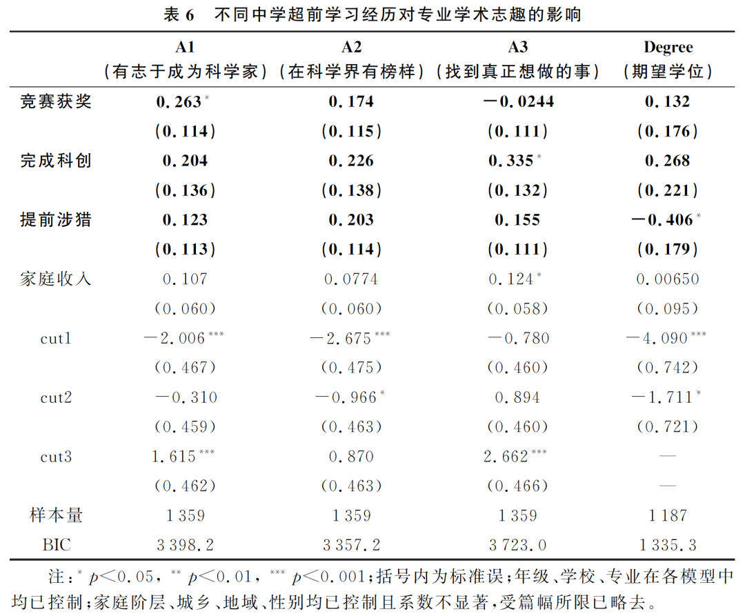 三類超前學習經歷對專業學術志趣的影響則不盡相同。在表6中,相比非“競賽獲獎”的學生,“競賽獲獎”學生有志於成為科學家並希望通過持續的努力做出重大科技貢獻的程度顯著更高,這是立志的表現。是否“完成科創”與“提前涉獵”在這一題上無顯著差別。“完成科創”學生顯著更認同“目前找到了自己真正想做的事”,可以説更早地明確了專業上具體的行動方向,有利於志趣的成熟。“競賽獲獎”與“提前涉獵”這兩個因素的影響則不顯著。至於學生計劃獲得的最高學位,“提前涉獵”的學生顯著更不願意讀到博士,而是否“競賽獲獎”與“提前涉獵”的學生所期待的最高學位沒有顯著差別。