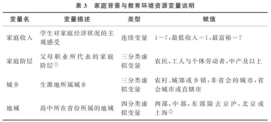 為了調查三類超前學習機會對資源的依賴程度,本文采用家庭收入、家庭階層以及生源地所屬城鄉與地域來反映學生的家庭背景與所屬地區的經濟、文化等發展水平。