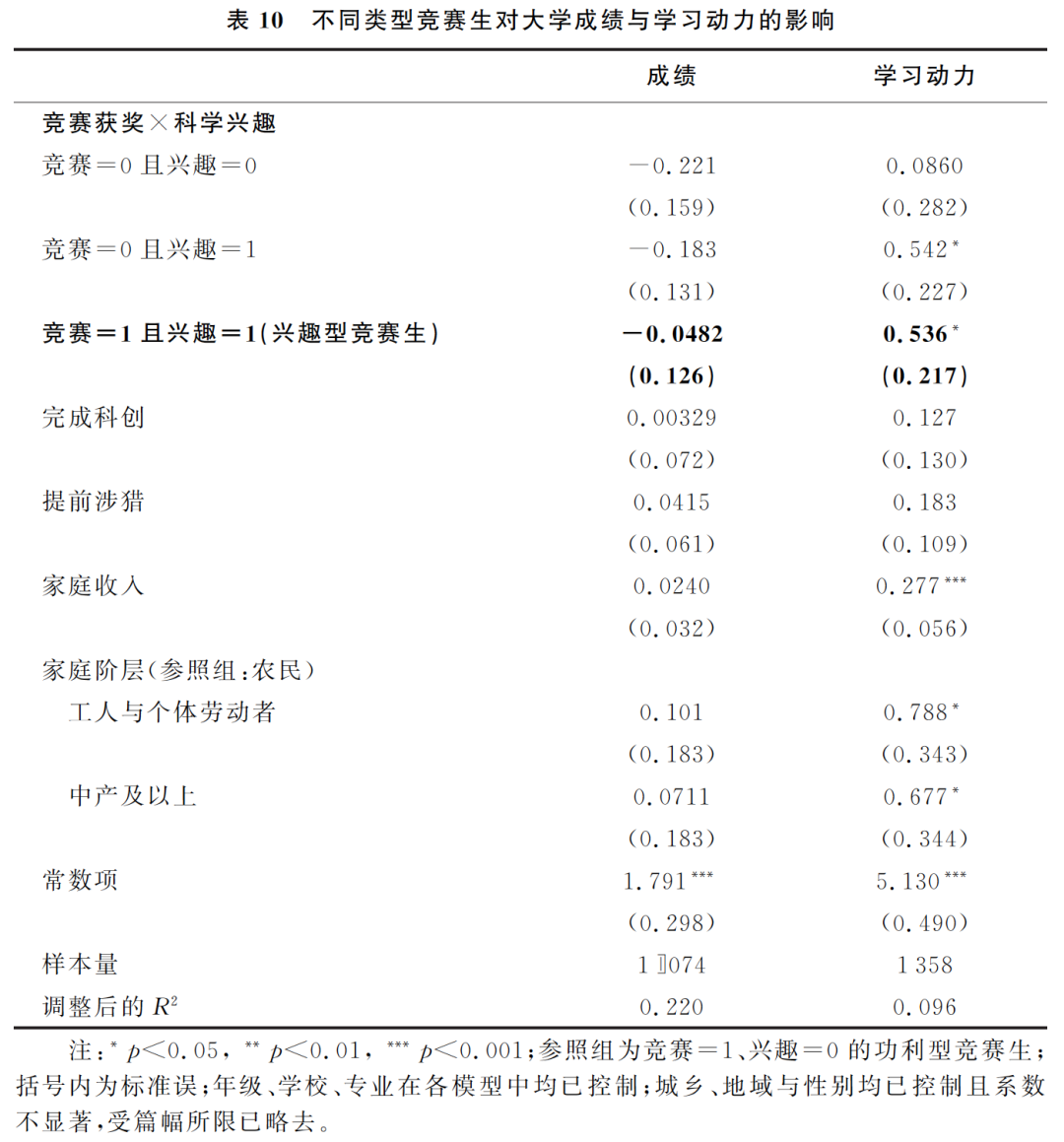 在此基礎上,為了區分功利導向與興趣導向的競賽生,觀察這二者在大學表現的不同,本文將“競賽獲獎”與“科學興趣”的交叉項放入迴歸模型中,基礎類別為“競賽獲獎”=1,且“科學興趣”=0。控制變量包括“完成科創”“提前涉獵”以及個人、大學、資源背景層面的其他變量。
