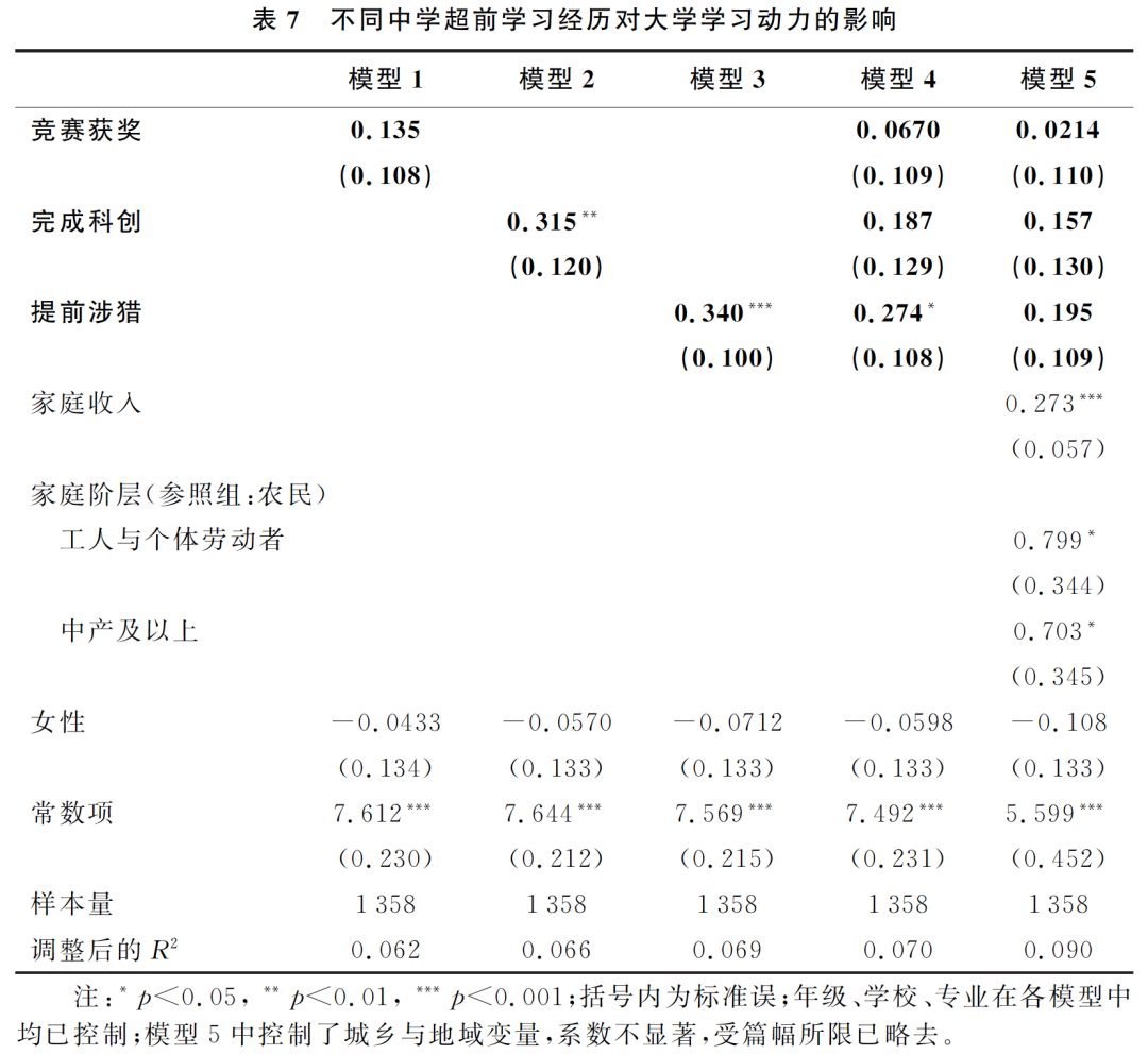 表7體現了三類中學超前學習經歷與大學時學習動力的關係。其中,“競賽獲獎”因素對大學時學習動力的影響不顯著。模型2與模型3中,“完成科創”與“提前涉獵”的學生大學時的學習動力顯著高於沒有相應經歷的學生;模型4中同時包含了“競賽獲獎”“完成科創”與“提前涉獵”,這時“提前涉獵”因素依然顯著,但在控制了家庭背景與生源地情況之後,中學提供與大學對接的講座、課程或實踐活動對大學學習動力的影響不再顯著。也就是説,相較之下家庭收入與家庭階層這兩個因素的影響更大。